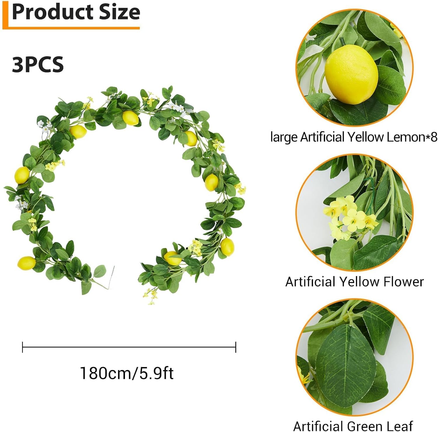 Brighten any space with these realistic artificial lemon garlands—vibrant, maintenance-free, and perfect for adding cheerful charm to your home, parties, or special occasions!Highlights at a Glance:- Artificial lemon garland with realistic lemons and green leaves - Faux greenery vines for spring and summer decor - Vibrant fake fruit vines for lemon party decorations - Durable, fade-resistant spring fruit garlands - Easy-care fake fruit garland for home or events - Cheerful lemon vines garland for table, mantle, or doorSpecification:Material: PlasticLength: 6.56 ft/2 mPacking List:3xArtificial Lemon Garland1xInstruction ManualNote:This artificial lemon garland is suitable for both indoor and covered outdoor spaces. Prolonged exposure to direct sun or harsh weather may affect the appearance and durability.To keep your lemon garland looking fresh, simply wipe it gently with a dry or slightly damp cloth. Avoid using strong chemicals or soaking in water.This faux greenery vine is for decorative use only. The lemons and flowers are artificial and not edible—please keep out of reach of small children and pets.