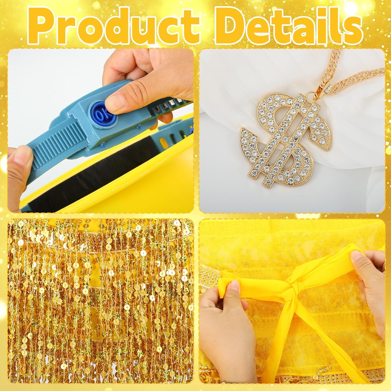 Features:This gold digger costume set features an adjustable hat and skirt to fit most people. Made of high-quality plastic, stainless steel, polyester, and sequins, it's comfortable and durable. The gold-themed set is dazzling, retro and fashionable , perfect for Halloween, themed parties, and various outdoor activities, helping you easily fit in and have fun!Specifications:Material: Gold hard hat: PlasticDollar sign necklace: PlasticGolden shovel: Stainless steelSequin tassel skirt: Polyester & SequinsColor: GoldSize: As the picture shownPackage Includes: 1 x Gold hard hat 1 x Dollar sign necklace 1 x Golden shovel 1 x Golden sequin skirt Notes:Manual measurement, please allow slight errors in size.The color may have a slight difference due to different screen displays.