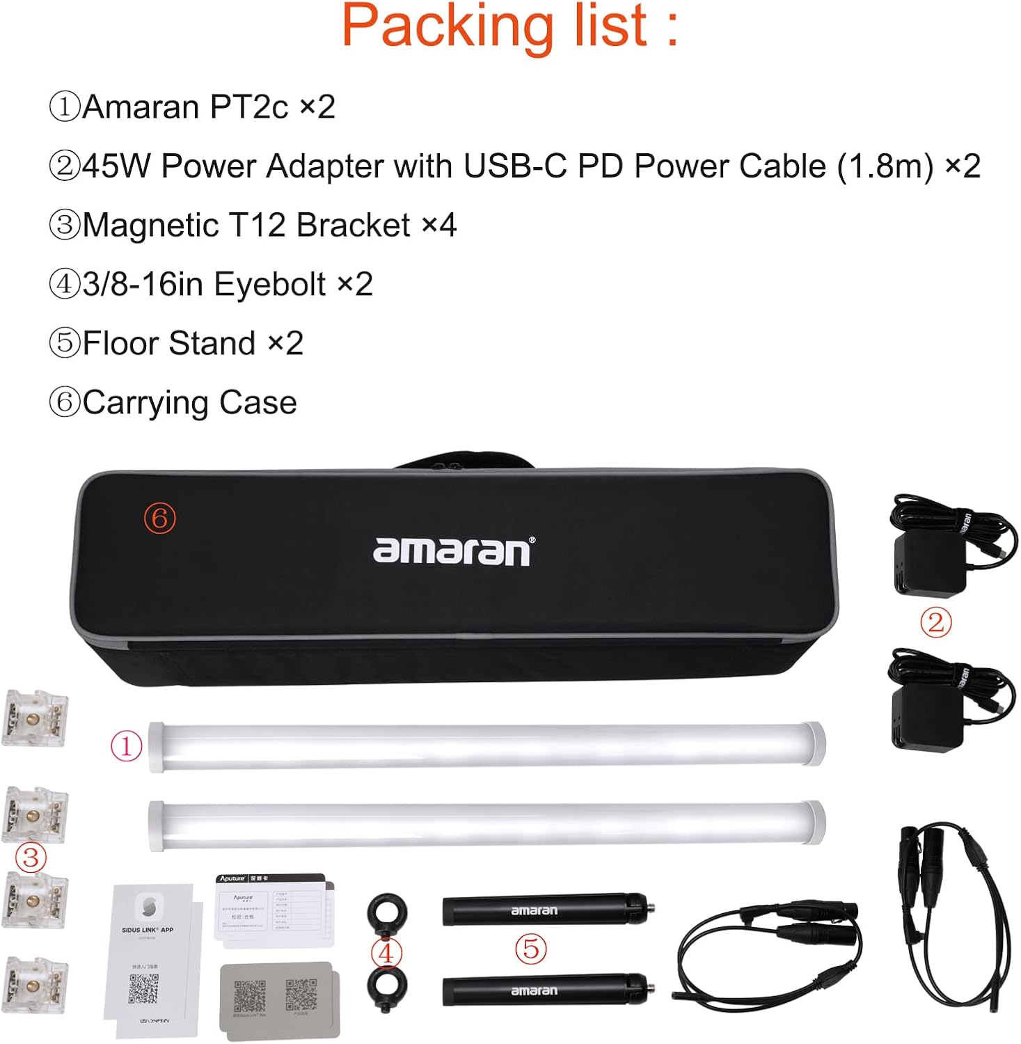 | Included Components | 45W Power Adapter with USB-C PD Power Cable (1.8m)×2, Amaran USB-C to DMX Adapter with USB-C Input×2, Floor Stand ×2/ Carrying Case ×1, Magnetic T12 Bracket×4 / 3/8-16in Eyebolt ×2, amaran PT2c ×2 |