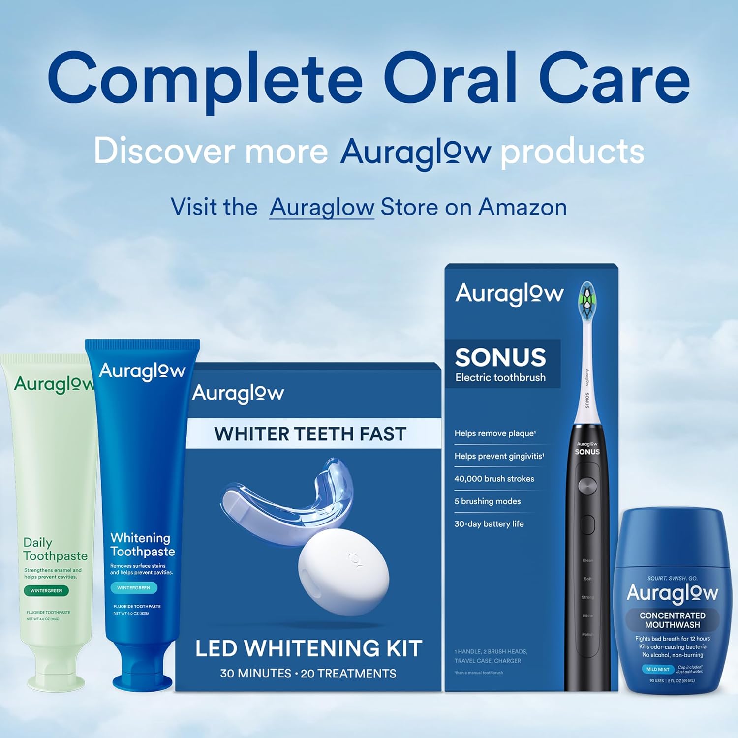 Get everything you need for months of professional-level teeth whitening at home with this Auraglow bundle. The Auraglow Teeth Whitening Kit pairs a powerful LED accelerator light with 35% carbamide peroxide gel to lift years of stains from coffee, tea, wine, soda, and smoking in just 30 minutes a day. The bundle includes a 35% carbamide peroxide gel refill pack — 3 syringes (15mL total) with 30 additional whitening treatments — giving you 50 total treatments to keep your smile bright for months. Clinically proven to whiten teeth up to 10 shades in 7 days. The LED accelerator light evenly activates and distributes the whitening gel across all teeth for consistent, full-coverage results with every session. All Auraglow whitening gel is made in the USA with dental-grade ingredients, is safe for enamel, produces no sensitivity, and is safe for caps, crowns, veneers, and fillings.