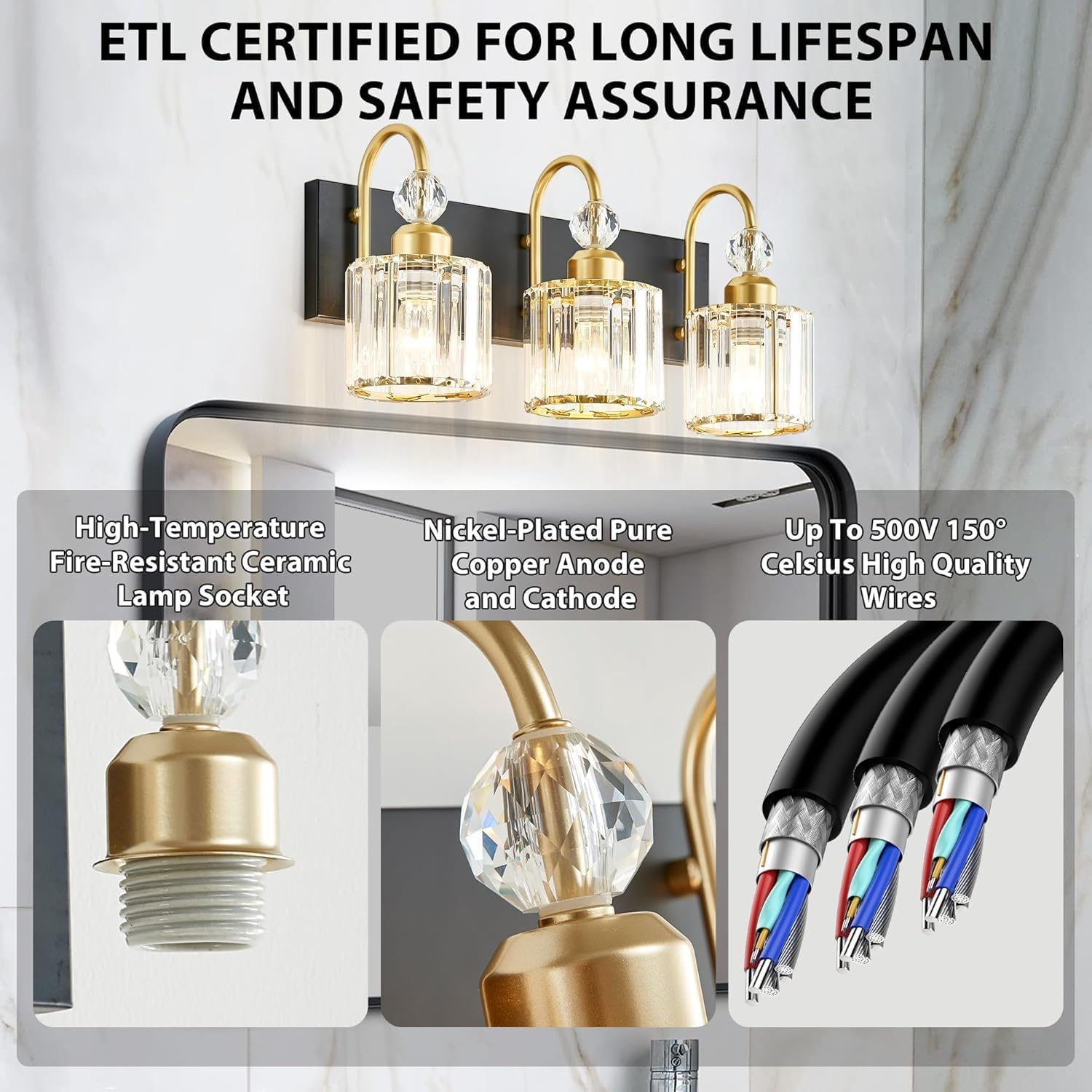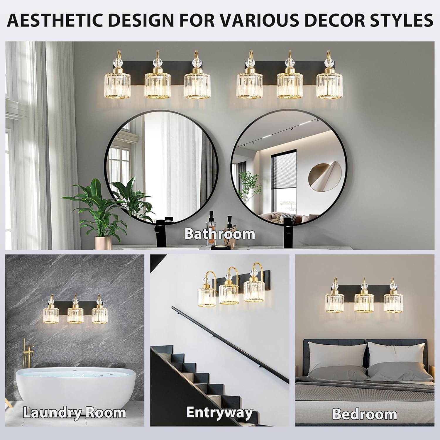 DIAMONDFORGE Bathroom Vanity Light Fixtures Over Mirror, Makeup Lighting for Modern Wall, Bath, Desk, Farmhouse, Hallway, 3 Crystal Lights, Black Gold