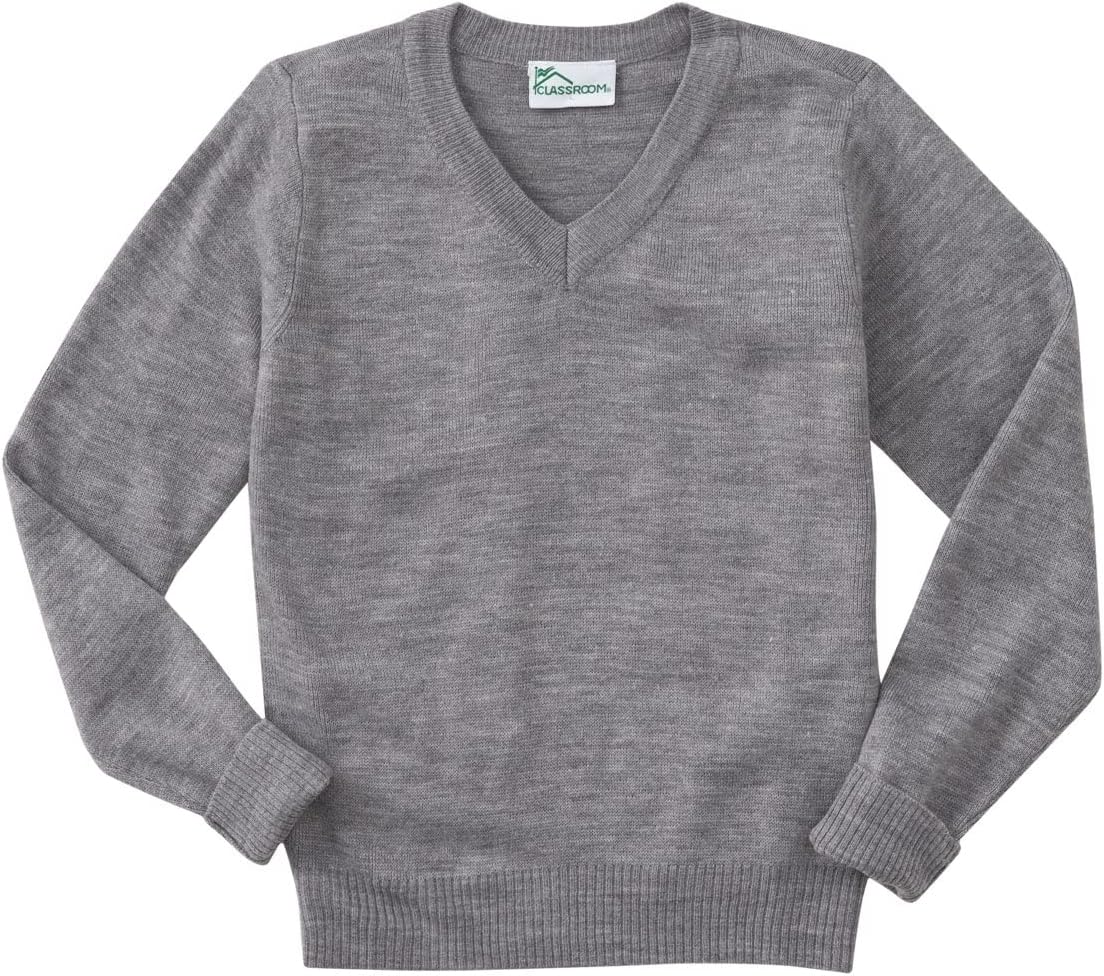 Unisex v-neck pullover sweater with half milano stitch and turn-back ribbed cuffs, collar and hem. No pill, easy care