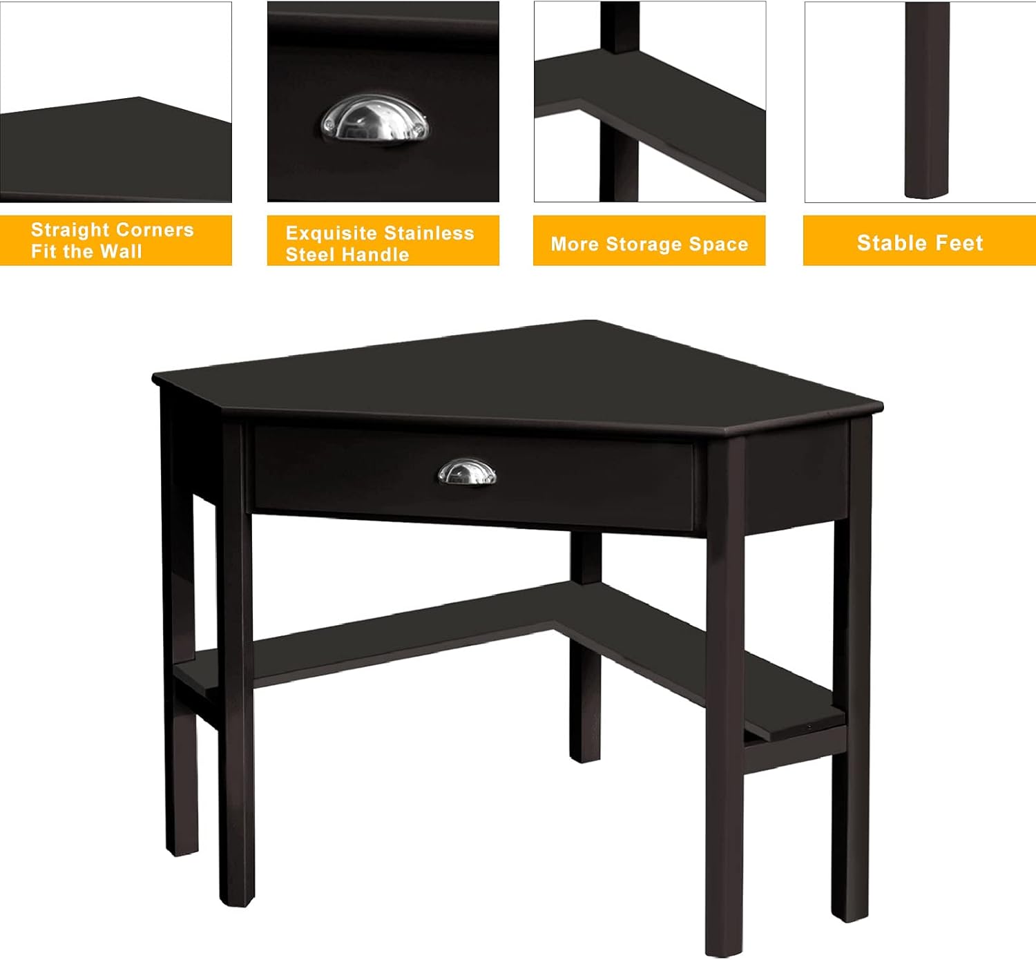 This sturdy corner computer desk is made of high quality premium MDF and pine, which ensures its long life span. Its large desktop and corner design provide spacious working space, 2 shelves and a large drawer offer ample space for your stuff. Modern style makes it suitable for any decor of your home, study and office. Specifications: Material: MDF & Pine Dimension: 106 x 71x 76cm/ 41.6 x 28 x 30 " (LxWxH) G.W.: 18.1 Kg/40.0Lb Color: Black Package included: 1 x Computer Desk 1 x Instruction