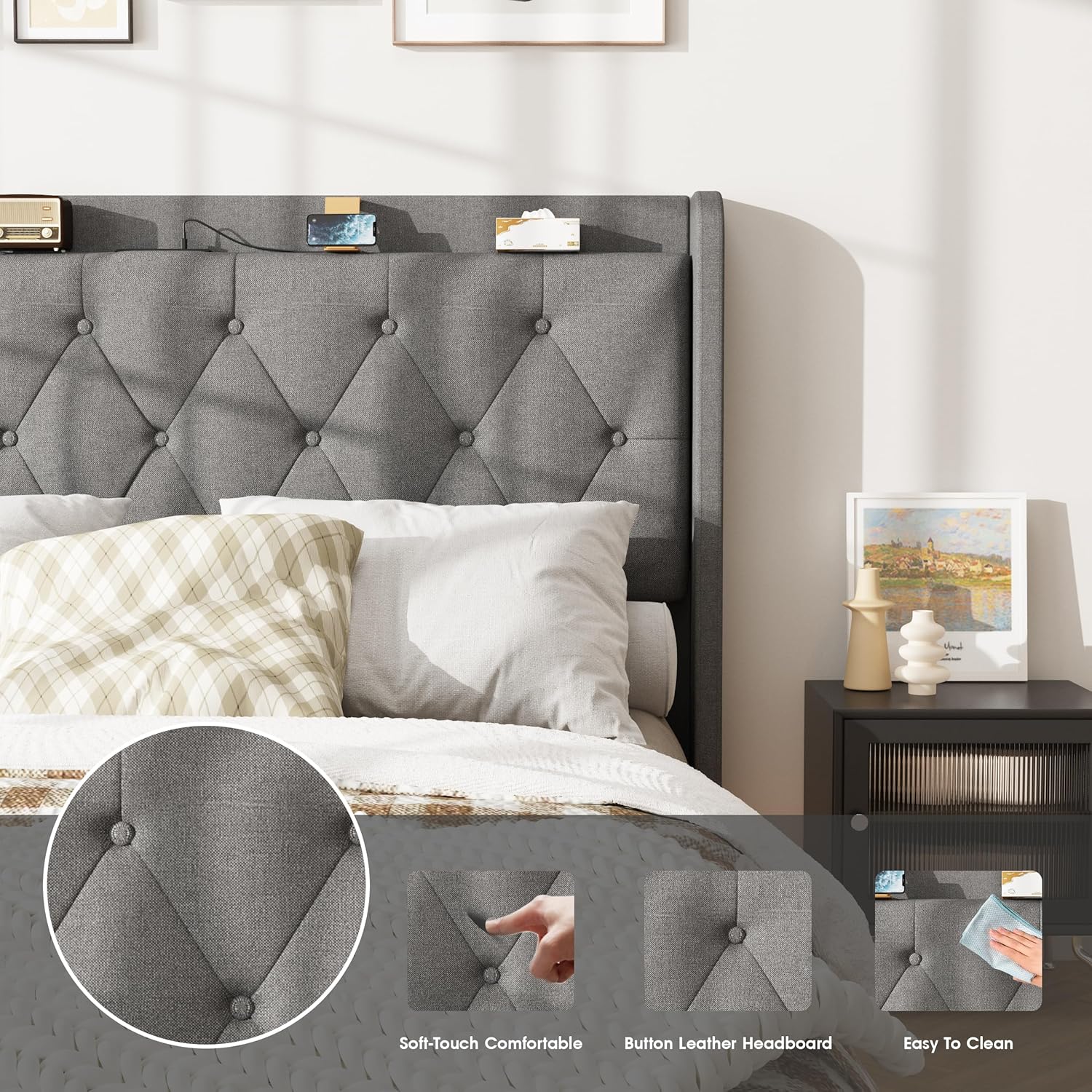 • [Linen Upholstered Button Tufted Headboard]: This bed frame with charging station is designed with the button tufted patterns, made by linen, have a better skin touch, comfortable and modern.