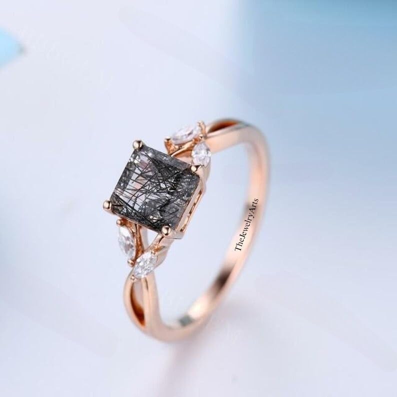 Most Welcome to "TheJewelryArts" Products Description Center Stone: Genuine Black Rutile Quartz Center Stone Size: 7x7mm Stone Shape: Square Cut Stone Side : Cubic Zircon Stone Clarity: VVS Material: 92.5 Sterling Silver, also available in 24k Rose Gold Vermeil/Gold Vermeil/Black Vermeil Stamp: 92.5 ➽OCCASION: Surprise your loved one with this beautiful engagement/wedding jewelry by TheJewelryArts . A classic piece of jewelry for all men/women in your life, this is a perfect gift for any occasion such as birthdays, anniversaries, wedding, engagements, Valentine’s Day or Christmas day mother's day.