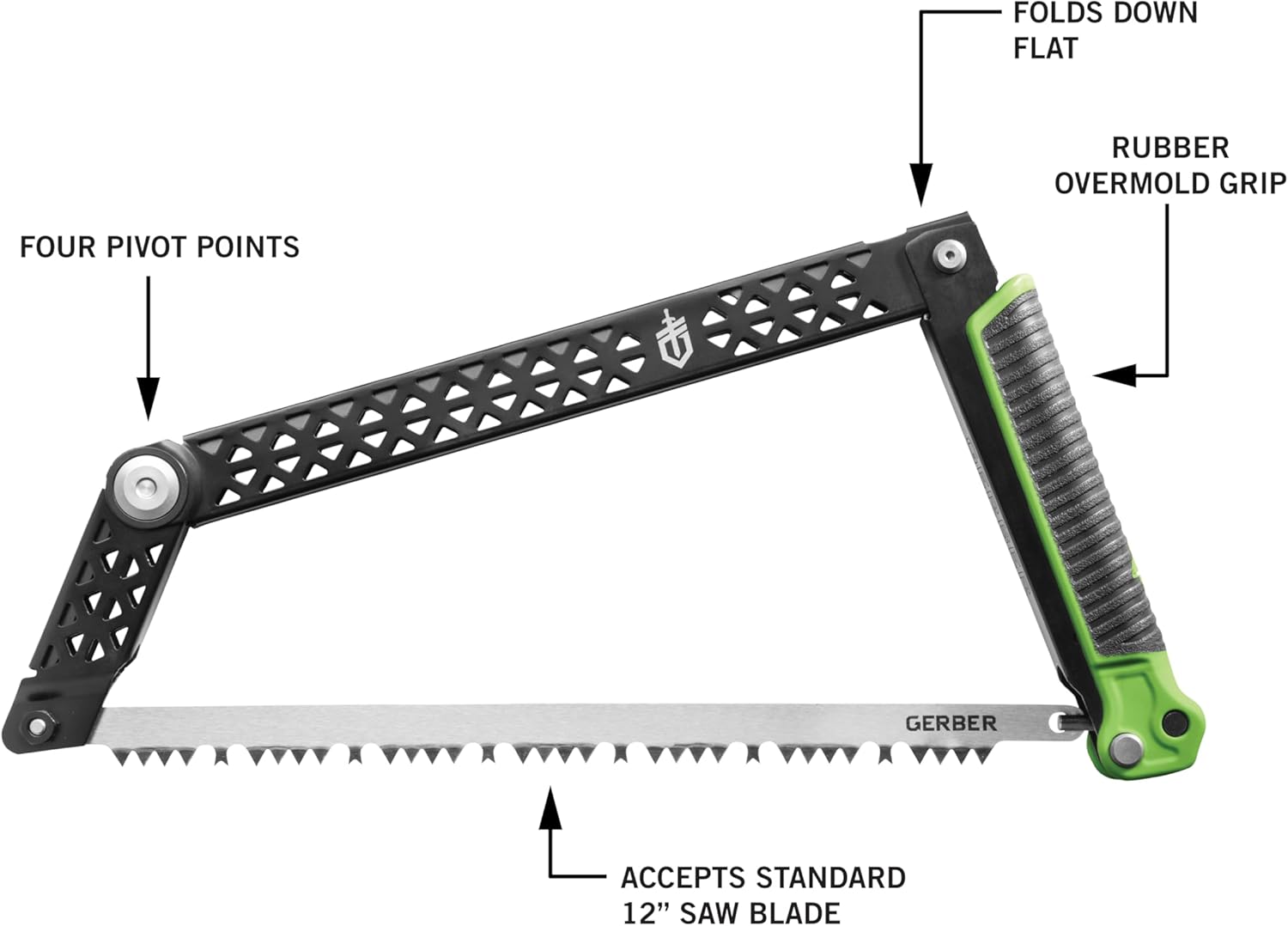 The Gerber Gear Freescape Camp Saw features an innovative design that allows the saw to fold up flat while remaining completely assembled and without threat of lost parts. It utilizes 4 pivot points to effectively cut larger diameter wood while using the full length of the blade. When folded up, the blade is protected and can be stowed safely in a gear kit or camp bin.BRIGHT ACCENTS FOR QUICK VISUAL IDIts bright green accents along the black rubber surface make it easy to spot in the shuffle of camp gear. The grippy rubber Freescape textured handle stays firmly in the hand no matter the conditions. Replace the saw’s standard 12” blade easily if required.