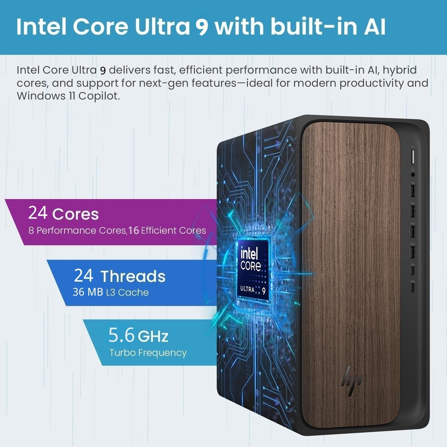 Key Features: CPU: Intel Core Ultra 9 285 Processor (24 Cores, 24 Threads, 36 MB L3 Cache, 2.5 GHz base frequency, up to 5.6 GHz max turbo frequency) Memory: Up to 64GB DDR5-5200MHz RAM Hard Drive: Up to 4TB PCIe NVMe M.2 Solid State Drive Operating System: Windows 11 Pro Graphics: Intel Graphics Front Ports: 1 x USB Type-C (USB 10Gbps) 1 x USB Type-C (USB 5Gbps) 2 x USB Type-A (USB 10Gbps) 2 x USB Type-A (USB 5Gbps) 1 x Headphone/Microphone Combo Jack Rear Ports: 4 x USB Type-A 2.0 1 x HDMI 1 x RJ-45 1 x Audio Out 1 x Display Port Keyboard: Wireless Keyboard and Mouse Combo Wireless Connection: Wi-Fi 6 and Bluetooth Dimensions: 13.27 x 6.10 x 12.40 inches Weight: 11.78 lbs Color: Black