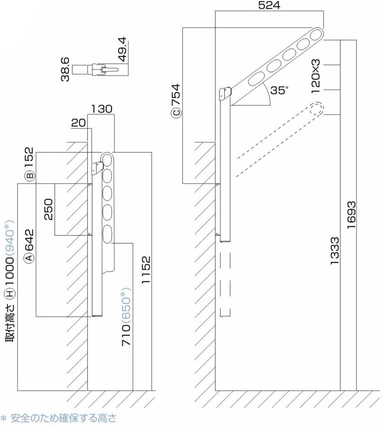 Hover screen GP shape for waist wall hanging that can change the height of the clothes Features a pole slide function that allows you to hang laundry in a high position. Smooth operation allows you to adjust the height to your preference. It has an adjustable function to prevent the rod hole and rod position from becoming low when stored. Adding a clothesline to prevent accidents such as falling off by accidentally passing the handrail.