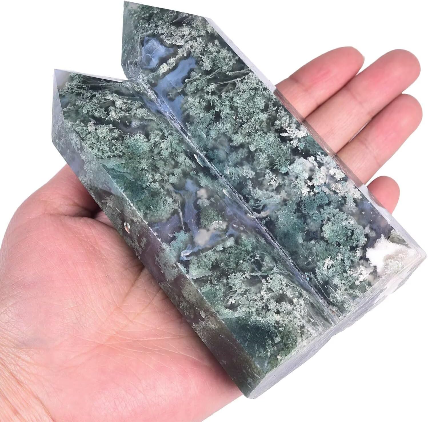 Large Heaing Crystal Stone Tower Two Pointed Wand Column Moss Agate Obelisk Meditation Stone