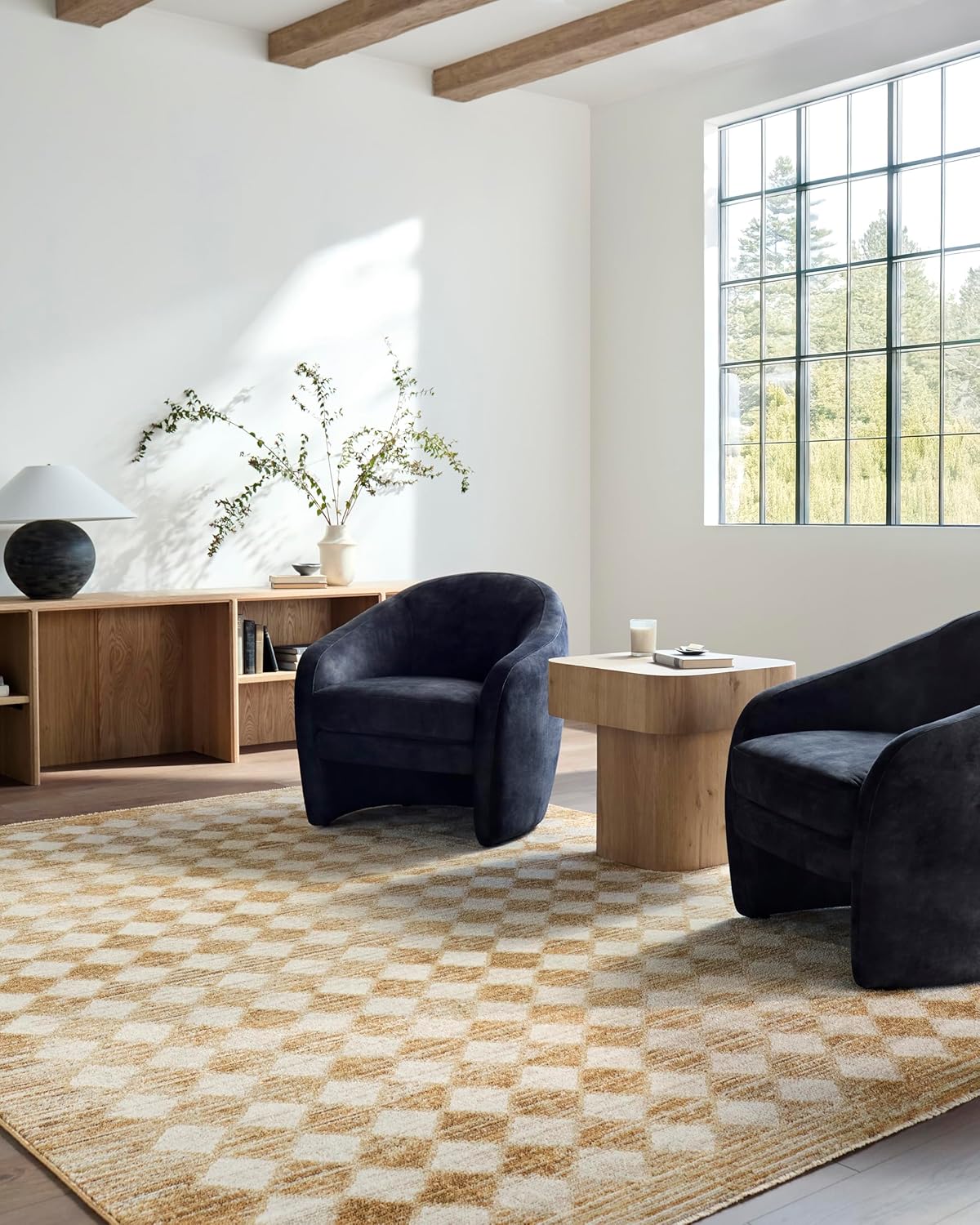 50% Polyester, 50% PolypropyleneMachine Woven in TurkeyMedium PileThickness: 0.71"Outdoor Safe: NoColors: Taupe, Mustard, Cream, Camel, Dark BrownRecommended Rooms: Living Room, Bedroom, Dining Room, Kitchen, Hallway, Foyer, Playroom, Kids RoomDyes, yarns and packing materials all have natural odors that are sometimes magnified after rugs are packaged. Any odors should dissipate within a week of being removed from the packaging. If your rug has a crease, we recommend laying flat or reverse rolling. Creases will disappear within 2 weeks.Designed by Galey Alix for Livabliss, the Myrtle Avenue collection is timeless and bold. This design features a bold updated checkboard design that’s on trend in its warm tones. Woven from durable polypropylene and soft polyester, it has a subtle fringe that elevates its charm. Its medium pile is soft underfoot and its machine made construction ensures that it’s durable enough for any space.