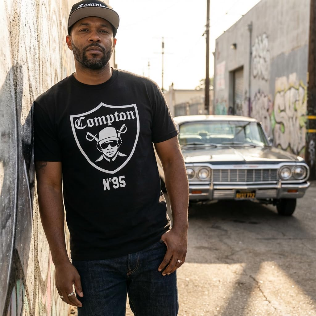 This shirt delivers raw Compton style energy inspired by Eazy era hip hop, Black and Silver street culture, and classic LA football influence tied to Oakland roots. The bold urban shield design reflects West Coast hip hop history, rap legend presence, and gritty streetwear identity. With strong Black and Silver contrast, this tee channels Compton Raider attitude, underground rap culture, and the visual language of West Coast streets where music, football pride, and urban style collide.