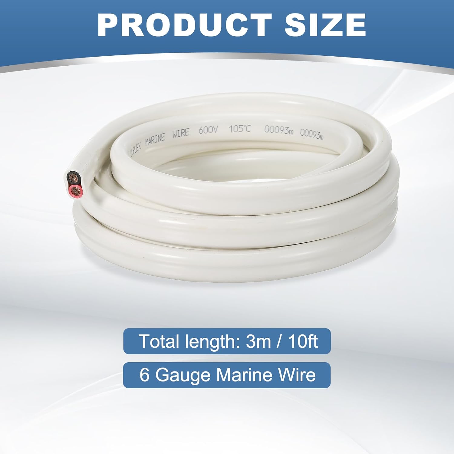 DURABLE MATERIALCrafted from premium tinned copper, our marine wires ensure good conductivity, stability and durability. Duplex tinned copper wire is designed with an insulating coating on the outside, which can provide strong protection while maintaining flexibility.MULTI APPLICATIONMarine cable can be used for electrical systems such as automotive, RV, boats, trailers, trucks, trains, and can also be used for wiring tasks such as wiring lights, speakers, solar inverters, and bilge pumps and more. Not only suitable for indoor home use, but also for heavy boats and other outdoor wiring projects with higher requirements.KEY POINTSMarine electrical wires meet standards, withstand a voltage of 600V and a temperature of 105℃ and have good corrosion resistance, making them suitable for marine environments and other harsh external conditions.PARCEL CONTENTWe will provide one piece of 10 ft 6 AWG 6/2 flat copper wire with white PVC jacket and red&black conductor sheaths, which meets many operational needs and ensures efficient power transmission and safety.EASY TO USEBoat wires are durable and flexible, easy to strip, crimp terminals, connect, cut and wrap. Marine wires can be used according to your project needs.