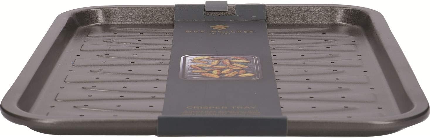 Product Description With a smart but simple design, the MasterClass crisper tray makes it easy to cook oven chips, pizzas and baguettes to deliciously golden crispness.Small aerating holes allow heat to circulate evenly around your food in the oven. This removes moisture and promotes better heat distribution, so there's less chance of unevenly cooked or baked results.This perforated oven tray has been designed to provide years of results. It's made of high-quality 1 mm-thick carbon steel with an electroplated finish, so it resists warping and rusting.At 39 x 31.5 cm (15½ x 12½ Inch), it's an ideal fit for most home ovens. It can also withstand temperatures of up to 220°C (428°F).Removing food once it's cooked is simple too. The crisping tray is finished with a double coating of the Quantum II non stick. It releases food in an instant. Like all baking trays from MasterClass's award-winning* core bakeware collection, it's totally free from PFOA, PTFE and BPA.(*Winner: Bakeware - Best of Best Sellers, Housewares Magazine, 2013, 2014, 2015) Set Contains: 1 x Master Class Non-Stick Crisper Baking Tray, 39 x 31.5 cm (15.5" x 12.5")