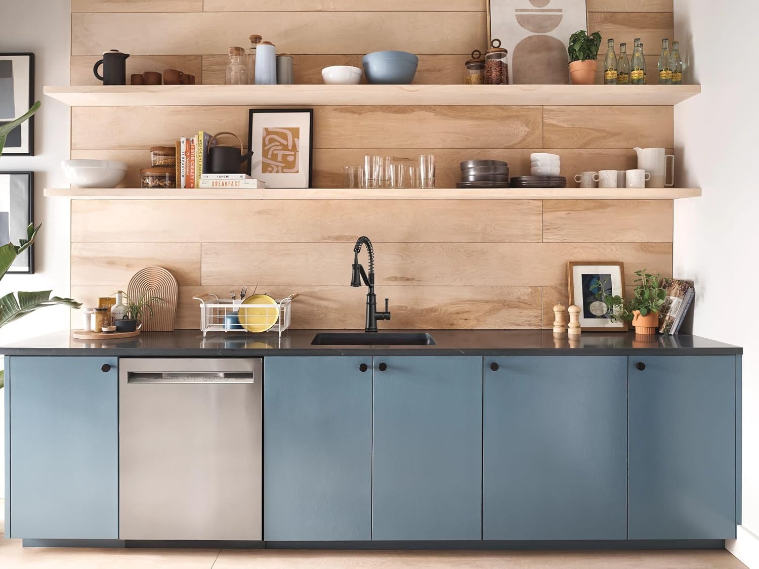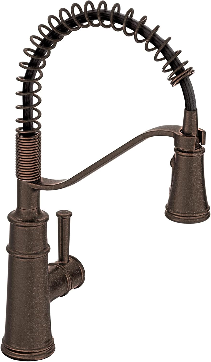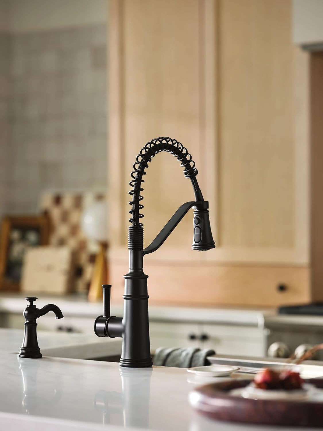 The Belfield Pre-Rinse Spring kitchen sink faucet offers extended reach and functionality while also adding elegant, intricate features to the kitchen sink. The Belfield collection artfully blends classic style elements with contemporary capabilities for a timeless and fresh appearance. Now with a lower profile, this Spring Galley kitchen faucet provides the convenience of a traditional spring faucet while maintaining a compact design for smaller sink spaces. Available in Moen’s Matte Black finish to add a dramatic and bold look to your kitchen.