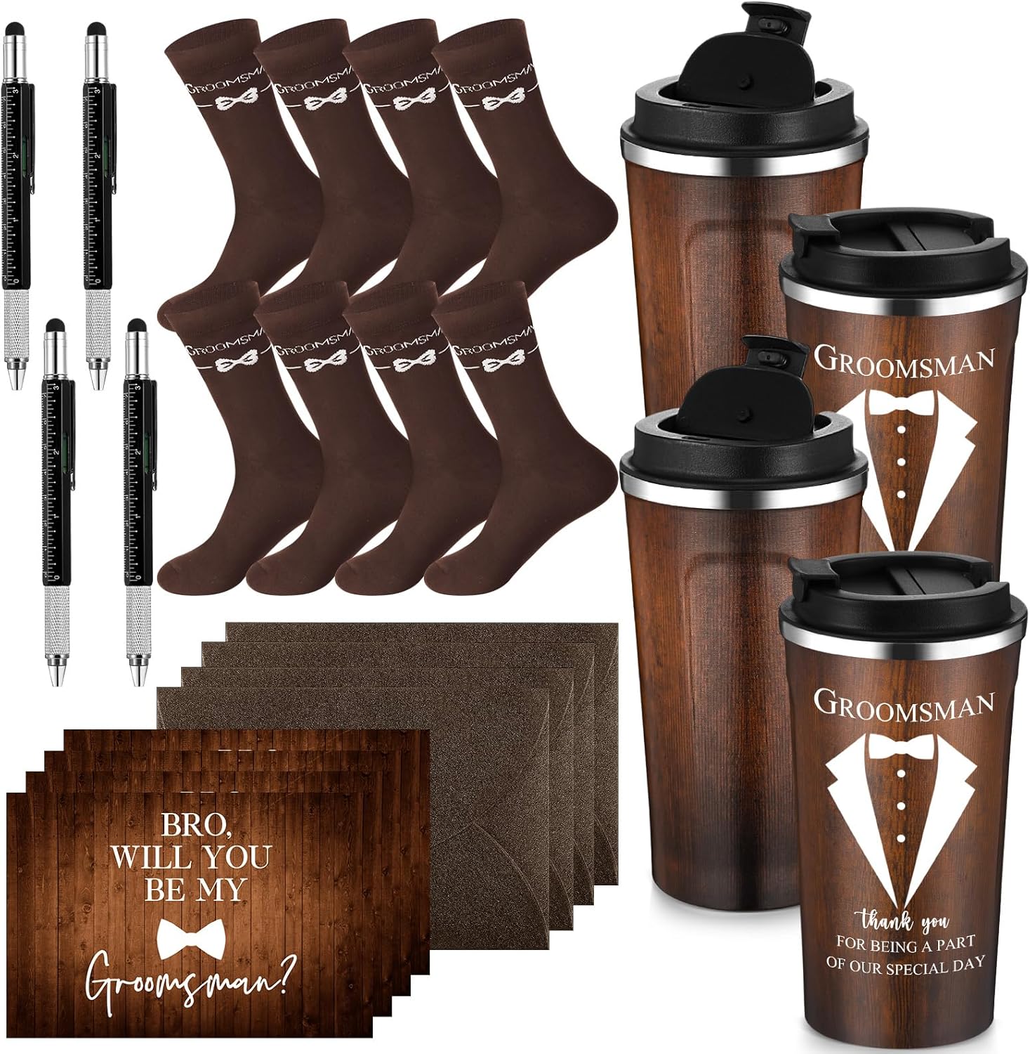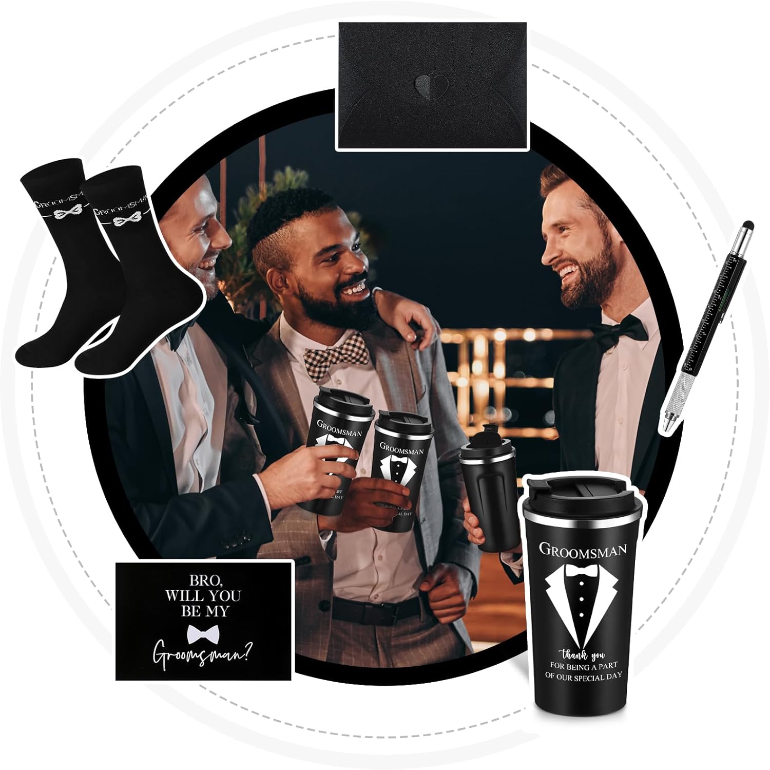 Features: Nice presents: This groomsmen tumbler cup is printed with a tuxedo pattern and some words, looks elegant and novel, you can apply it as a gift to send to groomsmen, showing your appreciation and concern for them. Conspicuous design: You could write some meaningful words on the groomsmen proposal cards and then put them in the beautiful envelope, and you could use them together or separately as you want. Specifications: Material: stainless steel, paper, cotton Color: mainly in black Size: Multitool pen: approx. 5.87 x 0.47 inches/ 149 x 12 mm Groomsmen tumbler cup: approx. 6.89 inches/ 17.5 cm of height, 3.46 inches/ 8.8 cm of diameter, 2.87 inches/ 7.3 cm of diameter of the bottom Card: approx. 5.91 x 3.94 inches/ 15 x 10 cm Envelope: approx. 6.1 x 4.13 inches/ 15.5 x 10.5 cm Capacity: approx. 20 oz Package includes: 4 x Groomsmen cups 4 x Metal tool pens 4 x Groomsmen cards 4 x Black envelopes 4 Pairs of wedding socks Notes: Manual measurement, please allow slight errors on size. The color may exist a slight difference due to different screen displays.