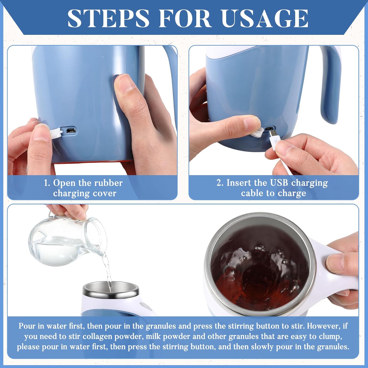 • Rechargeable USB Design: after the self mixing coffee mug runs out of power, you only need to connect the USB cable provided by us to the USB interface of our cup and then charge it, which is simple and safe to operate and can be applied repeatedly