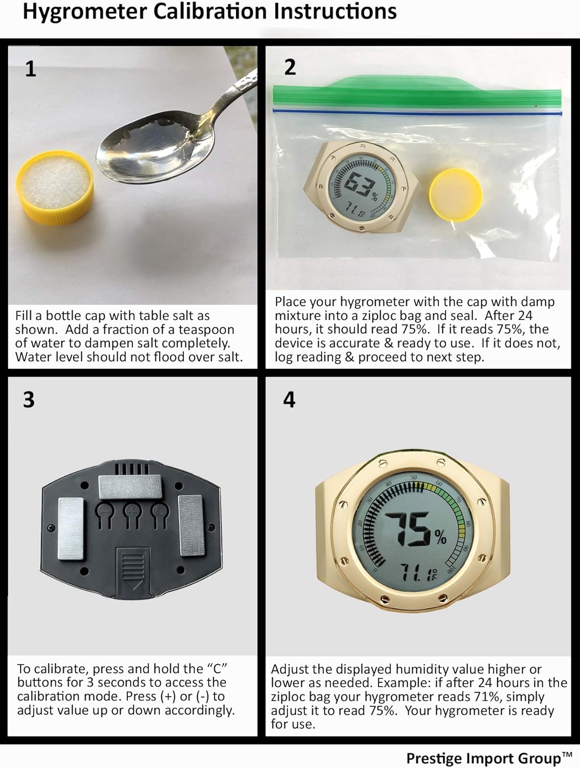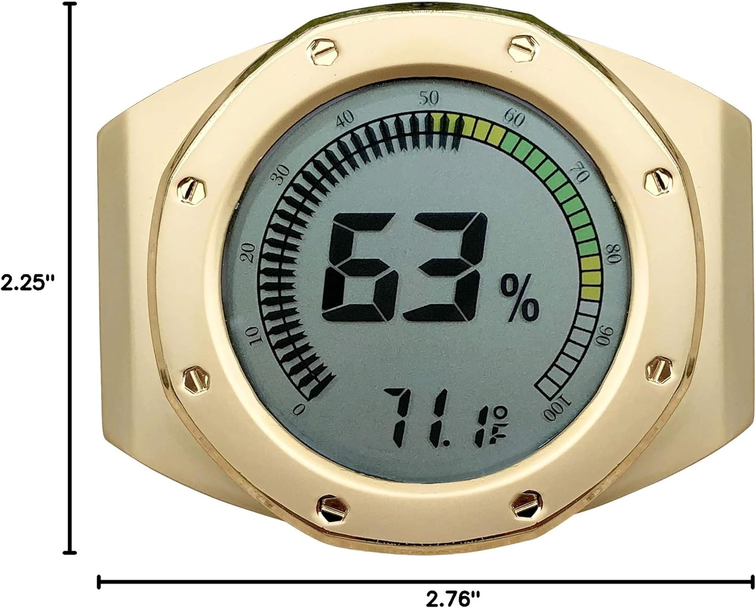 This new one-of-a-kind watch bezel style digital hygrometer is something you do not see every day! The watch bezel and case are done in a gorgeous finish. The very edge of the bezel features a high polished reflective shine for an amazing contrast. The bezel is also accented with rivet screw detailing in the same matching shiny finish creating a fantastic dimension to its overall appearance. Features a multi-colored gauge digital hygrometer that includes a calibration feature to adjust displayed humidity values. Minimum and maximum temperature and humidity values are recorded and stored to memory so you can easily keep tabs on your environment. Cigar lovers can monitor their stogies through this hygrometer's digital display! Relative humidity and temperature are clearly shown through an easy to read screen. Toggle between current temperature in Celsius or Fahrenheit. Includes a battery and mounting mag-net set to secure to the interior of your humidor. Looks fantastic in person!