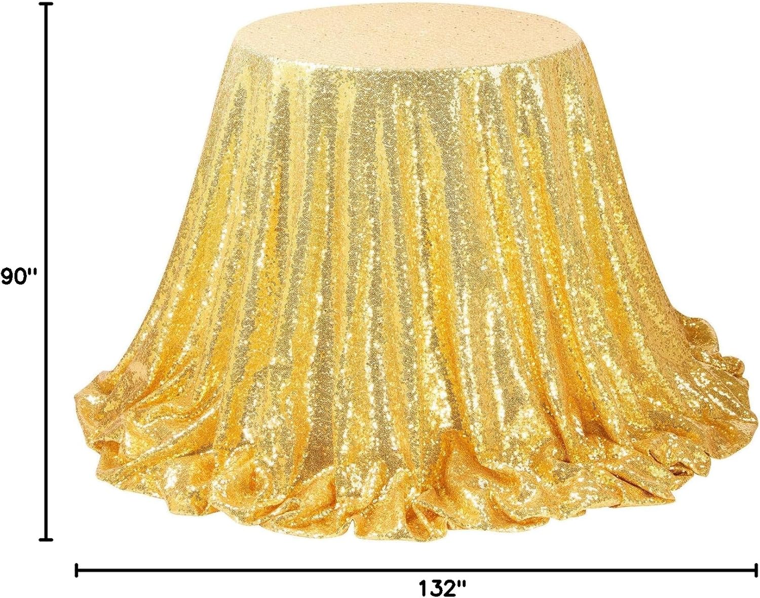 • Gold Sequin Tablecloth Size: 1 packs of Gold sequin tablecloth, the size of the Gold tablecloth is 90 W by 132 ​L inch. It's long enough to fit any round, rectangle or square table.