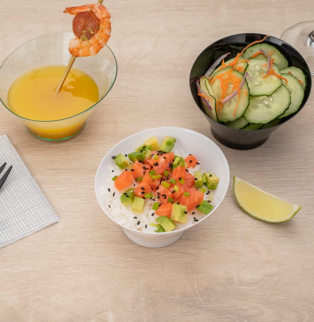 Create stunning appetizer and dessert tables using our Mini Serve 5-ounce Round White Plastic Small Incline Bowls. Crafted with premium plastic, these plastic bowls are conveniently recyclable for an eco-friendly cleanup after events. Featuring a shiny white finish and an incline design, these small disposable bowls are perfect for foodservice establishments looking to add a unique look to their meals. These white plastic bowls are crack-resistant and leak-resistant to prevent messy accidents while serving. Built with a sturdy base, these plastic bowls provide balance on surfaces to stop spills before they happen. Measuring 3.75 inches in width by 2.5 inches in height, these white plastic bowls hold up to 5 ounces. Sold in a 100 count box.