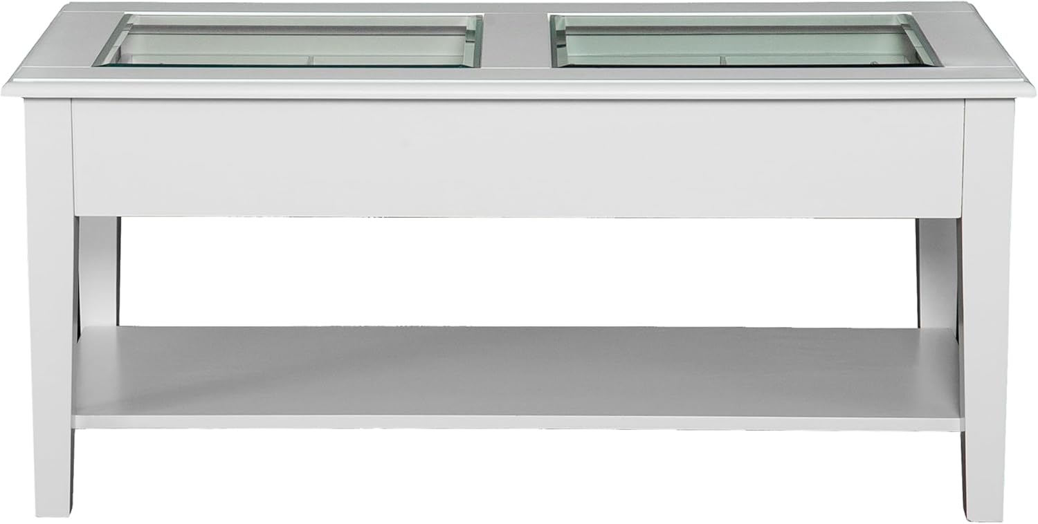 Complete your living room with this stunning cocktail table. With solid wood and glass construction, this contemporary off-white finished table would look lovely next to any sofa or chair. Brushed silver knobs on drawers also add a contemporary touch.The table displays a modern glass see-through top to display your shell or picture collections within for all to see, and features an extra storage shelf beneath the tabletop. This piece is sure to be a welcome addition to any home. Features 1 open shelf and 2 drawers; Each drawer includes a removable divider with 4 equal compartments. Dimensions include: Overall: 42" W x 22" D x 20" H; Drawers: 17.25" W x 16.25" D x 2.25" H; Bottom shelf: 41.75" W x 16.5" D x 9.5" H. This one-of-a-kind item approximately weighs 64 pounds and can support up to: 50 lb. (tabletop), 20 lb. (shelf), 10 lb. (each drawer). Only quality materials and manufacturing will do. product materials include: hardwood, wood veneer, MDF, 5mm tempered glass, metal. Assembly required. Made in China.