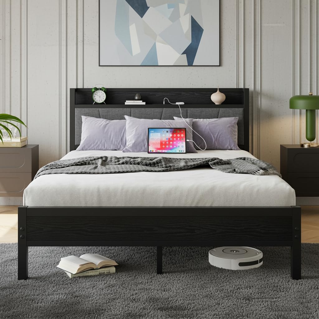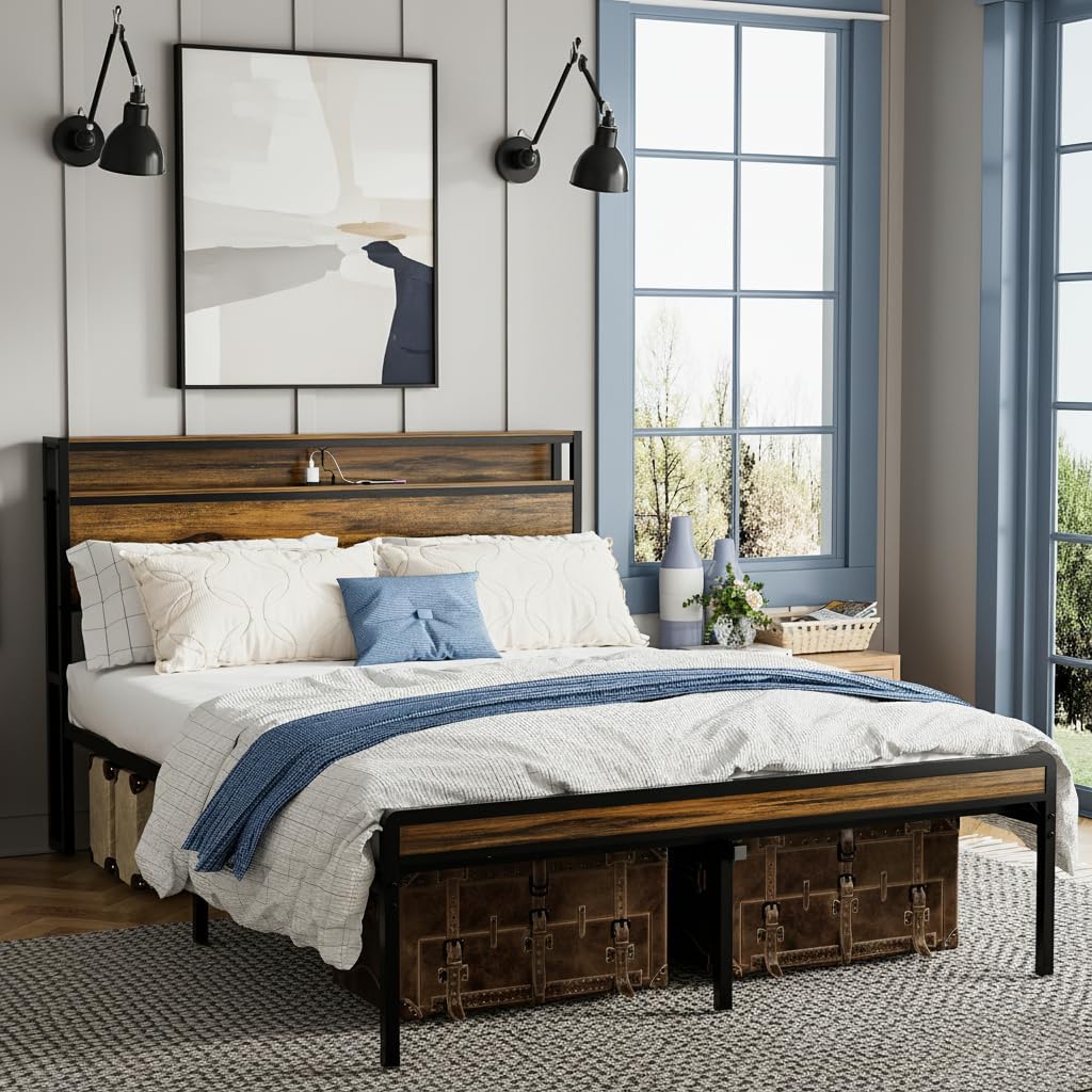 This bed combines a spacious headboard shelf where you can put your books, phone or glasses. There is plenty of space under the bed. It is very suitable for storing boxes, shoes or extra bedding. The high metal frame also enables your robot to vacuum effortlessly Material---Metal & Wood Color---Vintage Brown and Gray Origin---China Weight Capacity:300LBS Product Dimensions:81.26"L x 54.53"W x 38.78"H Overall Product Weight---60LBS
