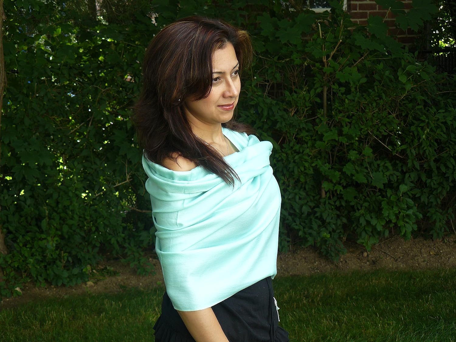 Unfazed by the scientific age, pashmina shawls are hand spun the same way it has been done for centuries. The hairs are gathered from the Himalayan goat called Hircus, which lives at high altitudes, 12 to 14000 feet in the mountains. The Pashmina is gathered by hand, stored and combed by nomadic herders. The threads are hand woven on hand looms over a silk wrap, which gives the fabric resilience. Once the fabric is loomed, each piece is hand dyed in open vats. Afterwards it is given to the different craftsmen for hand-embroidery, beading and /or printing. They are very soft and luxurious in feel. These shawls are woven from the best quality of Pashmina and Silk. These shawls can be worn as a wrap or a scarf. The size is 80 inches long and 36 inches wide and each shawl is finished with 2 or 2.5 inches long tassels. The fabric comprises of approximately 70% Pashmina Wool and 30% Silk.The combination of pashmina and silk makes the fabric versatile and resonating with color. The shawls are hand loomed in Nepal and India and are offered in a wide selection of vibrant colors. We recommend dry cleaning.