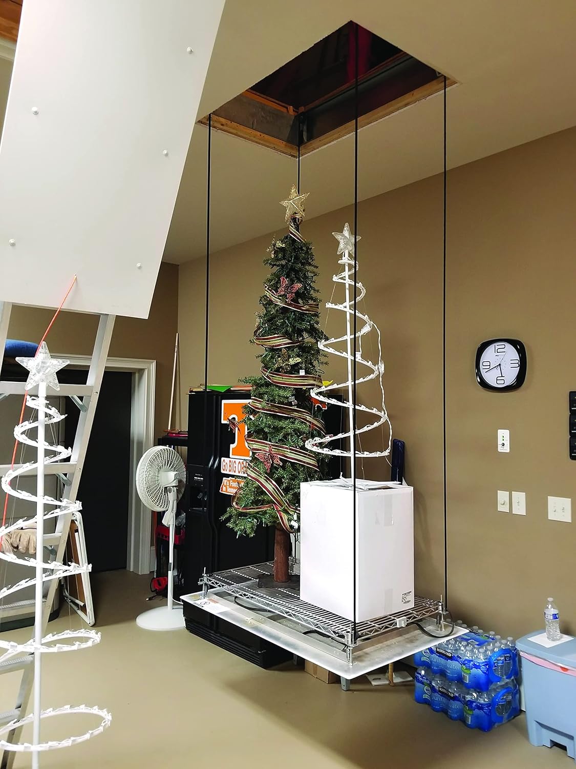 SpaceLift Motorized Attic Storage Lift: Need storage solutions? Just look up! Your best storage option is above your head. Safely move your storage and seasonal items to and from your home attic, garage loft, barn, or business attic storage. Works in tandem with any attic stairs because only you should be on the stairs. SpaceLift Attic Lift is a motorized platform capable of transporting up to 200 pounds and 24 cubic feet of cargo per trip from your living space to your attic (or basement) at three inches per second with the push of a button. It is like having your own mini freight elevator to carry storage in and out of your attic in just minutes; it’s a dumbwaiter for your stuff. It works in tandem with your attic stairs or ladder and comes in 2 sizes. Install yourself or choose an installer or handyman. Some assembly required. Two people, skilled in basic carpentry and electrical wiring can install the unit in two to three hours. Use your ladder for you and a SpaceLift for your stuff. It’s safer