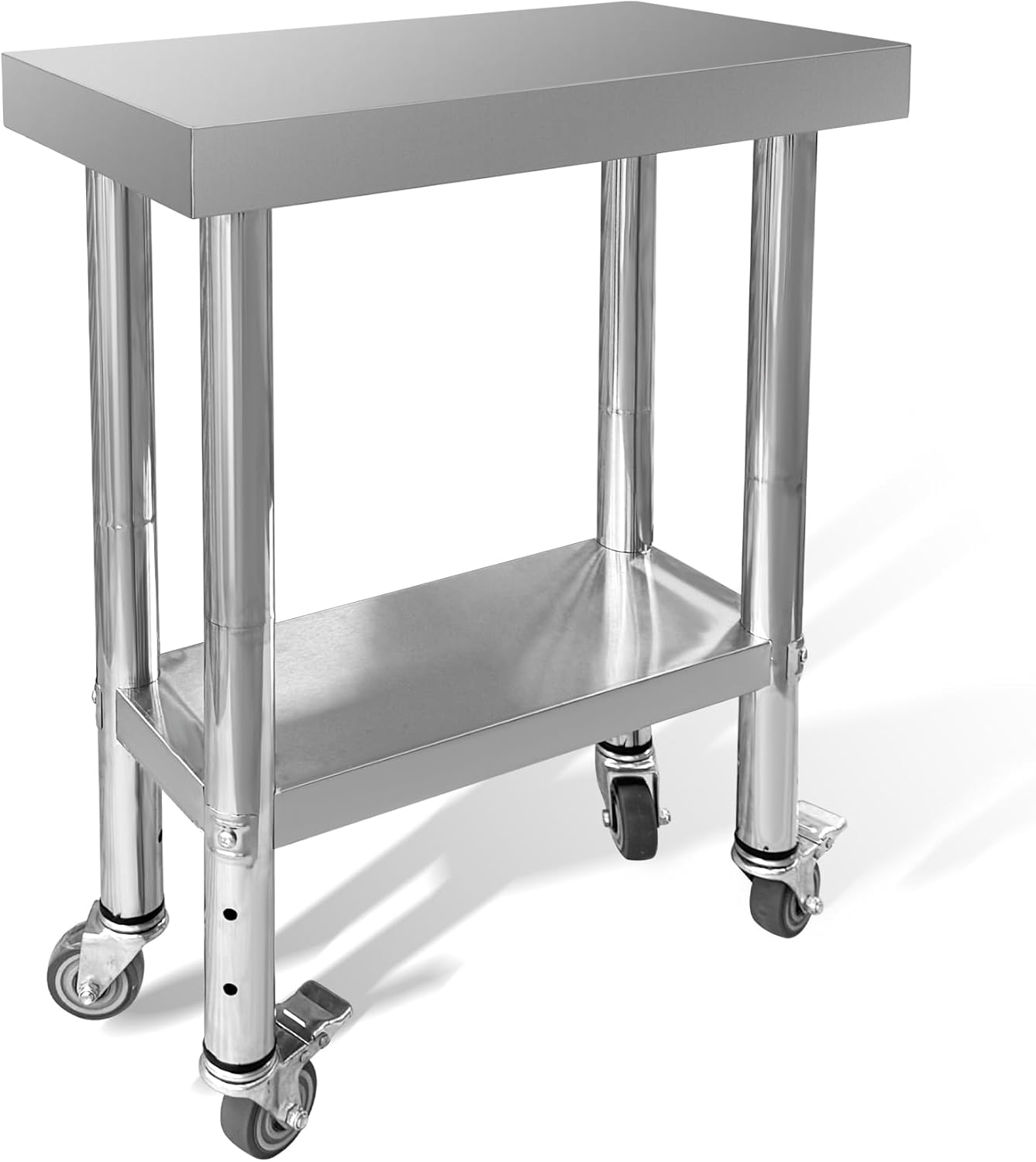 Specifications:Material: Stainless steelSize:24"Lx18"Wx34"HWeight:20lbShape: RectangularMaximum capacity: up-370lbs, down-270lbsTruly sturdy:All parts are made of stainless steel,rust-resistant and long-lastingAdjustable lower shelf: The stainless steel workbench can adjust the height of the lower shelf freely to meet your needsAdjustable height: Stainless steel workbench with adjustable foot height and anti slip pad for greater stabilityConvenient to move pulley: There are 4 universal wheels at the bottom, two of which can be quickly locked with one click It can be fixed in a certain position or easily moved, meeting the fast switching of locations for multiple scenariosMultiple sizes to choose from: Compact and flexible sizes to meet the needs of small apartments. Large size can stack various miscellaneous items, make full use of space, and cleverly fill and utilize the gaps between furnitureWidely applicable in multiple scenarios:Kitchen - Settle it in your kitchen as a perfect workbench for yourcooking utensils or any other tools.Outdoor - Easy to be moved to your garden in case of any BBO,outdoor family gatherings or friends party uses.Restaurant - One single or multiple preparation worktable is helpful toliberate you from complex cooking burden.Installation details: Easy to install, the installation video in the linked image is clear and detailed, and the installation process is simple and fast