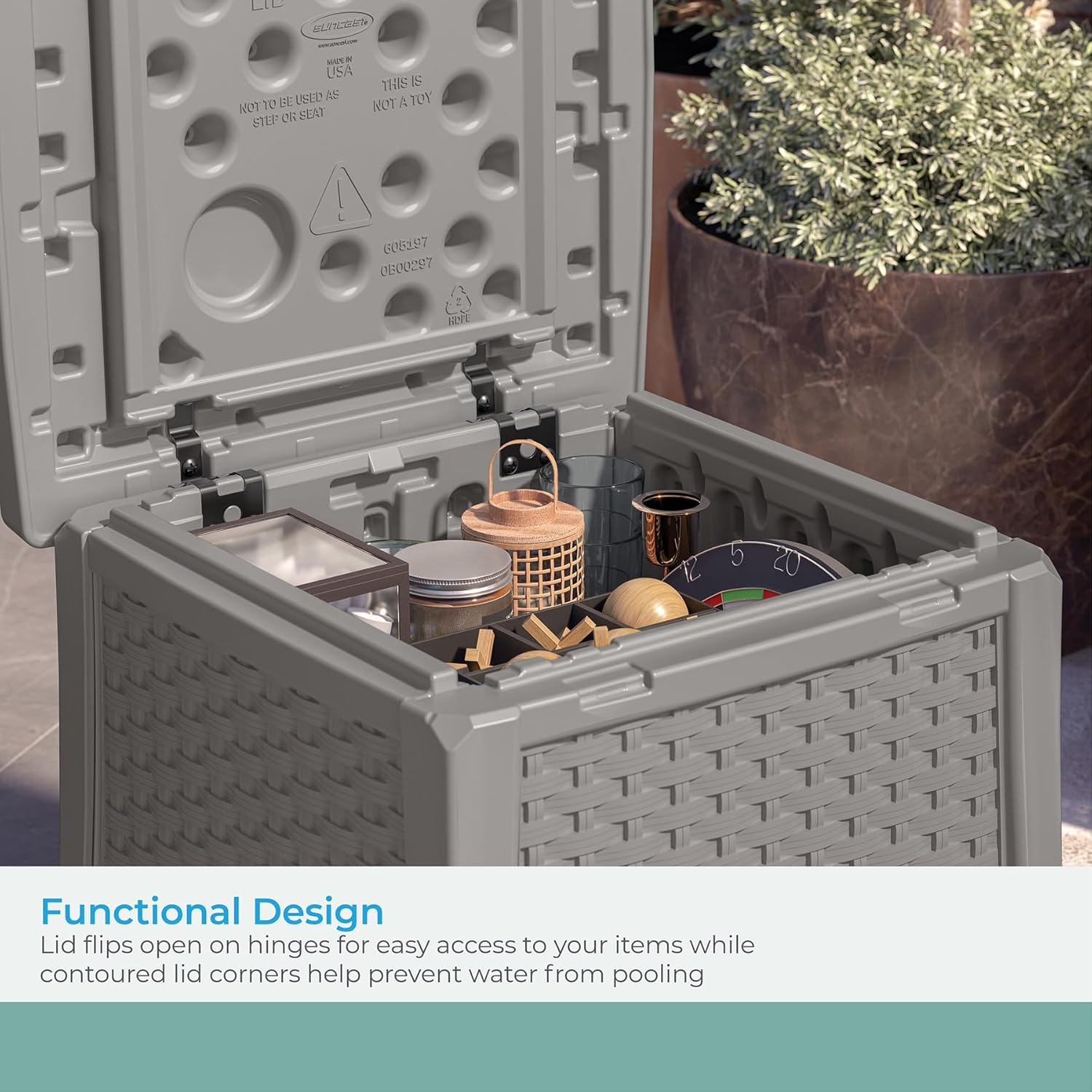 The Suncast 13 Gallon Resin Outdoor Patio End Table Storage Box combines practical storage with a stylish design, making it the perfect addition to your patio or deck. This compact yet spacious patio end table with storage offers 13 gallons of storage capacity, ideal for stowing away outdoor essentials such as pool accessories, cushions, and grill supplies. Crafted from durable, water-resistant polyresin, the box is built to withstand the elements, resisting fading, rust, and weather damage. Its functional design features a hinged lid that flips open for easy access to stored items, while the stay-dry lid prevents water from pooling inside, ensuring your items stay dry and protected. Measuring 18.75" x 18.75" x 18", the box offers ample storage without taking up too much space, making it an excellent choice for smaller areas. Whether used indoors or outdoors, this versatile storage solution adds both utility and a touch of style to your living space.