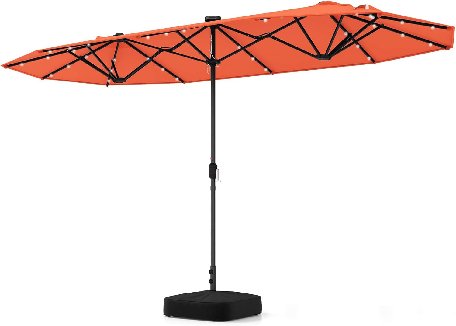 DescriptionOur twin outdoor umbrella offers comfortable shading place for garden, backyard, patio and market. If you have needs to block up the sunlight, our double-sided umbrella will be your ideal choice. Comes with 15.4’ x 9.2’ large canopy, this patio umbrella will provide roomy shading space for you to enjoy the coolness. Since the durable polyester fabric, the umbrella will effectively block up the sunlight, and the fabric is fade resistant for long-term outdoor use. What’s more, there are 48 solar LED lights on the ribs to offer brightness and enhance romantic feel during night talk. The hand crank mechanism facilitates umbrella opening and closing, and the widen base with weighted sand bag (sands are not included) increases using stability. With all parts given in the package, the umbrella installation is quick to finish by following the detailed instruction. FeatureDouble-sided canopy offers spacious shading space 12-rib metal structure ensures excellent sturdiness 48 LED lights are powered by top solar panel Convenient hand-crank system for easy opening & closing Vented canopy top enhances air circulation Fadeless fabric makes sure long-term outdoor use Extra bottom base with sand bags (sands are not included) for high stability Wide application in patio, garden, backyard and market SpecificationColor: Burgundy, Beige, Brown, Orange Material: Steel, Polyester Fabric Overall Dimension: 470cm x 280cm x 251cm / 15.4’ x 9.2’ x 8.2’ (LxWxH)Umbrella Pole Diameter: 48mm / 1.9” Base Dimensions: 72.5cm x 72.5cm x 15cm / 2.4’ x 2.4’ x 0.5’ (LxWxH)Net Weight: 18kg / 39 lbsPackage includes:1 x Patio Umbrella 1 x Base 1 x User’s Instruction