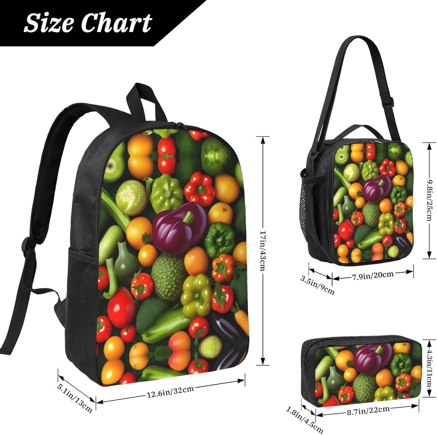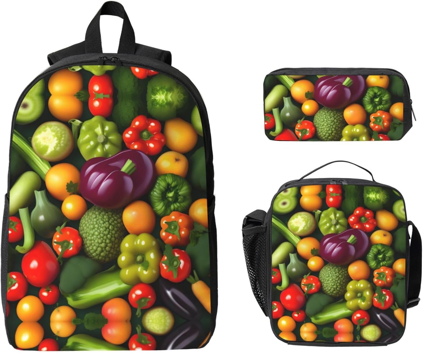The Vegetable Fruit print Backpack with Lunch Bag, Pencil Case is made from robust Oxford fabric that provides a reliable and long-lasting performance for anyone who values functionality. The dimensions of the backpack (12.6x5.1x17 inches) allow for comfortable storage of your essentials, while the lunch bag keeps your food at the right temperature, perfect for day trips or outdoor activities. The pencil case offers a tidy solution for your writing materials, completing the set with added practicality and style for a variety of uses, from hikes to daily errands.