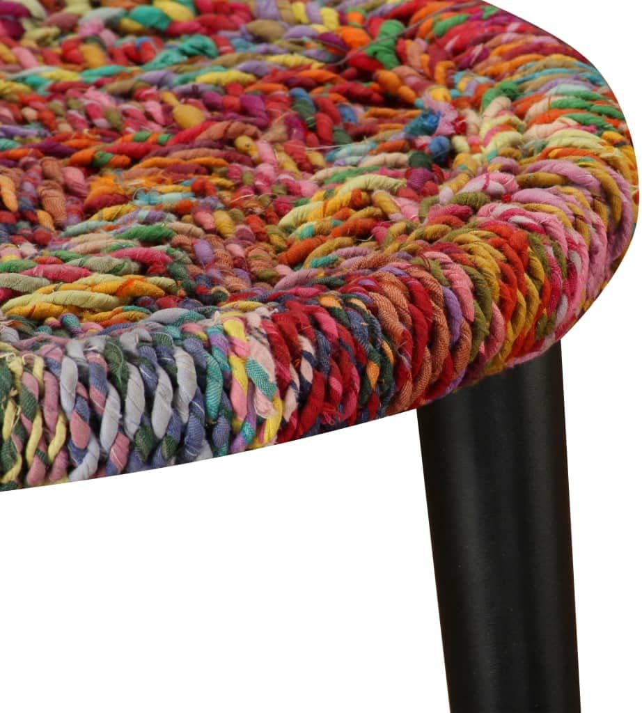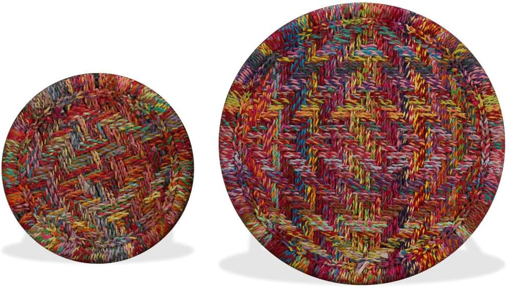 This 2-piece fully handmade coffee table set with beautiful and colourful chindi details will make a stylish addition to any living room.The nesting tables are both stylish and practical. Their exotic design will make these end tables focal point of any living space. These table stands exude a natural charm. The tabletops, on which you can place decorative items like fruit baskets, vases or drinks and snacks, are decorated with colourful, woven details. The strong steel legs add to their sturdiness and stability.Delivery includes two coffee tables. Important note: The colours vary from piece to piece, making each piece unique; delivery is random.Colour: MulticolourMaterial: Chindi weave details + powder-coated steel frameLarge table dimensions: 23.2 x 18.5" (Diameter x H)Small table dimensions: 15.7 x 15.4" (Diameter x H)Fully handmadeDelivery includes 2 coffee tablesFabric: Cotton: 100%