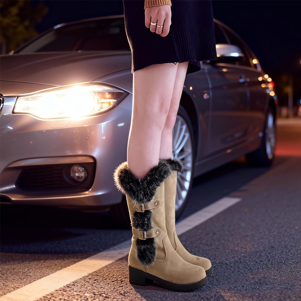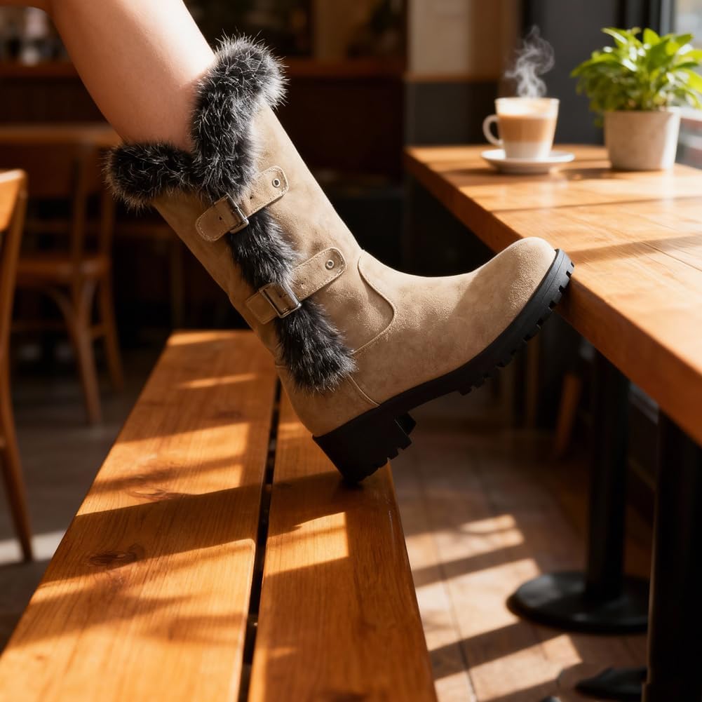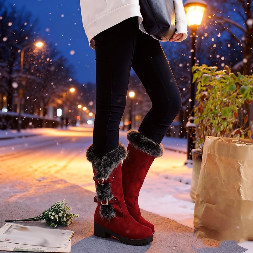 Women's Imitation Suede Warm Mid Calf Snow Boots - Fur Mid Calf Warm Suede Fuzzy Shoes - Outdoor Water Proof Anti-Slip Warm Plus Fleece Cotton Retro Winter Snow Tall Boots Features: Plush faux fur lining provides exceptional warmth and all-day comfort in cold winter conditions Hidden wedge platform heel offers subtle height, stability, and comfortable support for walking Waterproof faux suede upper keeps feet dry and protected in snow and wet weather Non-slip rubber outsole delivers reliable traction on icy, snowy, and slippery surfaces Mid-calf to tall boot design enhances warmth while creating a stylish, flattering silhouette Adjustable buckle and lace details ensure a secure fit, suitable for wider calves Soft fleece interior cushions feet, reducing fatigue during extended outdoor wear Versatile winter style easily pairs with jeans, coats, and sweaters for everyday outfits Product Includes: 1pcs *winter boots Note: 1.Due to manual measurement, please allow a difference of 1-5g/1-2cm 2.Due to different displays and different lighting, the picture may not reflect the actual color of the item. Thank you for your understanding